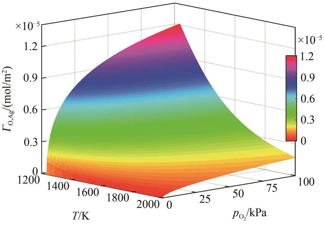 由圖7可知,當溫度低于1500 K時,ΓO,Ag隨氧氣壓力升高顯著增加;當溫度高于1500 K時,由于液態Ag-O系中的氧溶解度顯著降低,ΓO,Ag隨氧氣壓力的增加,其增加幅度減小。觀察圖8可知,η隨著溫度和氧分壓的升高而呈現下降趨勢。這是因為式(27)中的表面偏析平衡系數KII與溫度呈負相關,當溫度升高時KII減小,導致表面氧濃度降低。此外,在較低的氧分壓條件下,O原子傾向富集于表面;當氧分壓升高時,更多的O原子溶入液態Ag-O系中,引起η減小。