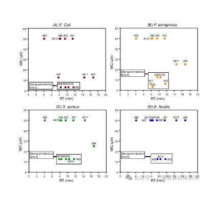 圖3、設(shè)計(jì)的抗菌肽的疏水性由它們的HPLC保留時(shí)間確定,與它們對(duì)不同菌株(A)大腸桿菌、(B)銅綠假單胞菌、(C)金黃色葡萄球菌和(D)大腸桿菌的抗菌活性之間的關(guān)系。
