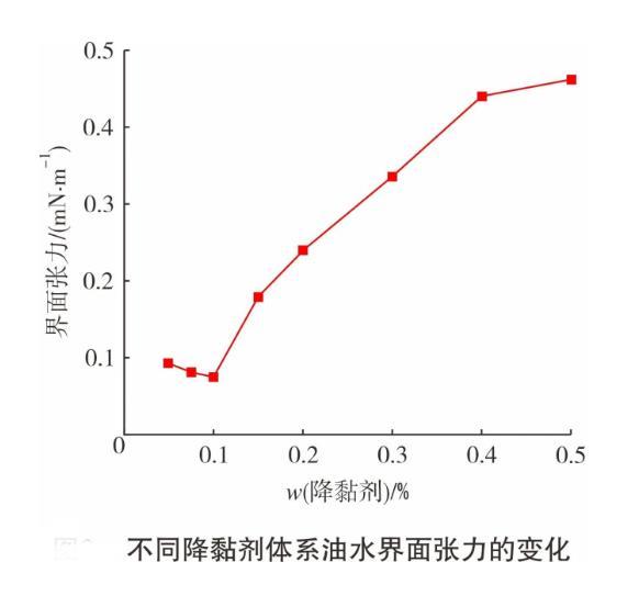圖1為在不同降黏劑質(zhì)量分數(shù)下,體系油水界面張力的變化情況。從圖1可知,在降黏劑質(zhì)量分數(shù)為0.05%~0.10%時,界面張力隨質(zhì)量分數(shù)增加而降低。當(dāng)降黏劑質(zhì)量分數(shù)超過0.10%時,界面張力開始上升。在低質(zhì)量分數(shù)下,降黏劑在油水界面上形成吸附膜,降低界面張力。當(dāng)降黏劑質(zhì)量分數(shù)超過臨界膠束含量后,降黏劑在界面聚集數(shù)量增加,吸附層排布更不規(guī)則,導(dǎo)致界面張力升高。