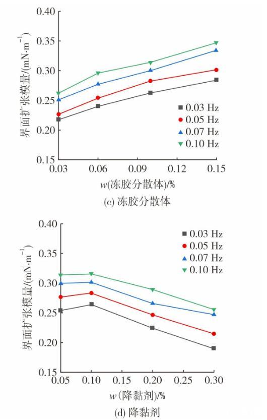 圖2(b)和圖2(d)為降黏劑質(zhì)量分數(shù)對界面流變性質(zhì)的影響,凍膠分散體質(zhì)量分數(shù)固定為0.06%。在降黏劑質(zhì)量分數(shù)為0.05%~0.10%的范圍內(nèi),隨著降黏劑質(zhì)量分數(shù)的增加,動態(tài)界面張力穩(wěn)定值下降。但當(dāng)質(zhì)量分數(shù)超過0.10%時,隨著質(zhì)量分數(shù)的增加,動態(tài)界面張力穩(wěn)定值增大。體系的擴張模量變化趨勢與動態(tài)界面張力相同。在低質(zhì)量分數(shù)情況下,隨著降黏劑分子數(shù)量的增多,逐漸在油水界面形成有序的吸附層,使得界面膜的強度不斷增大,動態(tài)界面張力降低,界面擴張模量增大。而在高質(zhì)量分數(shù)下,降黏劑在界面層吸附飽和后,質(zhì)量分數(shù)繼續(xù)增加會增強空間位阻效應(yīng),使降黏劑的部分親水基團從水相中逸出,形成膠束聚集體,對吸附膜的強度產(chǎn)生負面影響,使得界面擴張模量減低。因此,當(dāng)降黏劑質(zhì)量分數(shù)為0.10%時,體系在稠油界面層形成的界面膜最為穩(wěn)定,體系的乳化降黏能力最強。