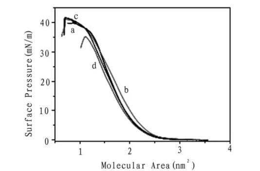 壓縮/擴展等溫循環實驗:當膜壓達到預先設置的靶壓,停留5min后滑障反方向等速擴展至初始位置,在初始位置停留5min后,再反方向等速壓縮至設置的靶壓,來回循環3次,壓膜速度10mm/min.