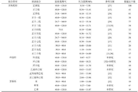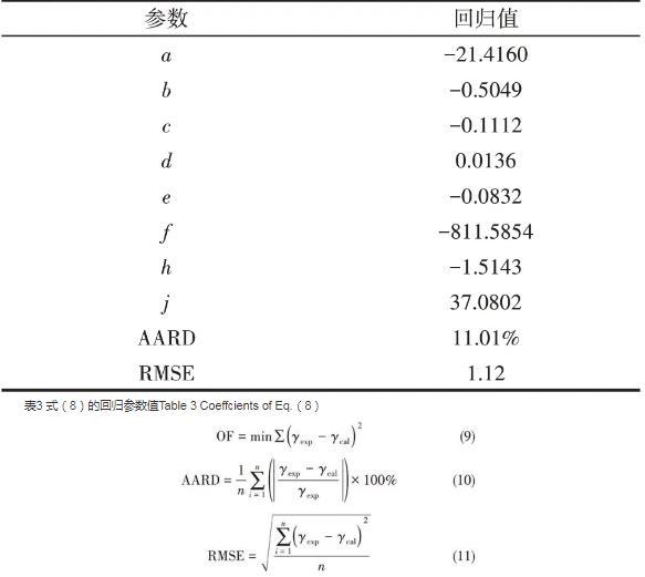 2.4.2實驗數(shù)據(jù)回歸及模型參數(shù)的求取本研究系統(tǒng)收集了文獻數(shù)據(jù),并將研究測定的實驗數(shù)據(jù),共計932個數(shù)據(jù)用于回歸,回歸所用數(shù)據(jù)見表2?;貧w參數(shù)由最小二乘法得到,其目標函數(shù)如式(9)所示。采用平均相對偏差(AARD)和均方根誤差(RMSE)表示計算效果,如式(10)、式(11)所示。回歸結(jié)果見表3。