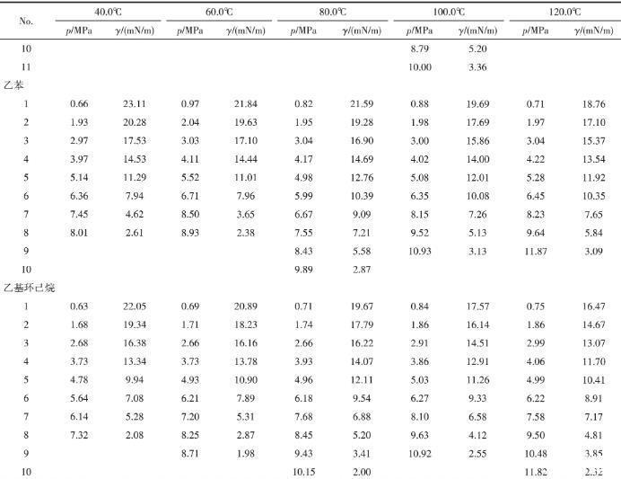 為探究相同碳原子數(shù)、不同結(jié)構(gòu)的影響,選取60℃下CO2-乙基環(huán)己烷/乙苯體系進行比較。由圖7可以看出,兩種體系的界面張力下降趨勢基本相同,但CO2-乙苯的界面張力略高于CO2-乙基環(huán)己烷體系。姬澤敏等、Nagarajan等曾對CO2-苯/環(huán)己烷體系的界面張力進行過測定,發(fā)現(xiàn)兩種體系界面張力隨壓力變化的等溫線幾乎重合,而CO2-乙基環(huán)己烷/乙苯體系界面張力差異明顯。從分子層面考慮,這是由于乙苯的極性比乙基環(huán)己烷大,從而導(dǎo)致乙苯分子間的相互作用更強,處于界面層的乙苯分子更難擴散到CO2中去,使得CO2-乙苯體系的界面張力大于CO2-乙基環(huán)己烷體系。