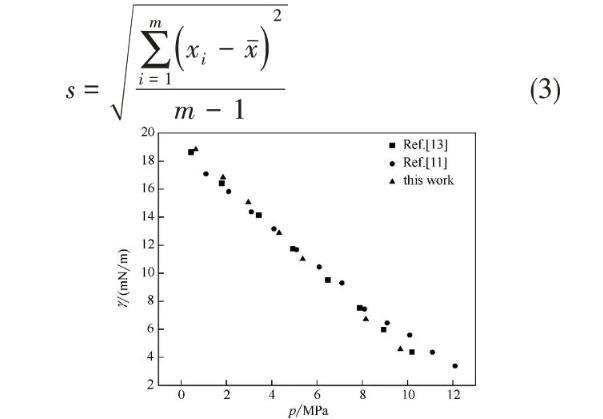 本研究測定了CO2-環(huán)戊烷/環(huán)己烷/環(huán)辛烷/甲苯/乙苯/乙基環(huán)己烷體系的界面張力,測量的溫度范圍為40~120℃,壓力范圍為0.27~14.70 MPa。實驗數(shù)據(jù)見表1。并繪出實驗數(shù)據(jù)的標準差圖,結(jié)果如圖3所示。結(jié)果表明,所有數(shù)據(jù)的標準差均在0.36 mN/m以內(nèi),證明數(shù)據(jù)的準確性較好。其中,標準差的計算如式(3)所示