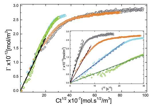 圖 5 吸附量 (G) 作為乘積 Ct1/2 的函數。 這 插圖顯示了不同體積的 G 與 t1/2 的單獨曲線 微凝膠顆粒濃度:(>)0.10 g l-1 , (D)0.20 克 l-1 , (,) 0.50 克 l-1 , (B)1.00 克 l-1 . 實線是直線擬合和虛線 用使用 D ? DDLS 計算的斜率繪制。