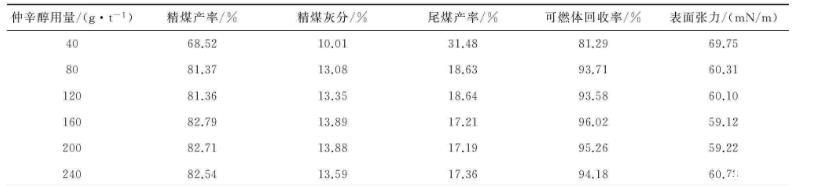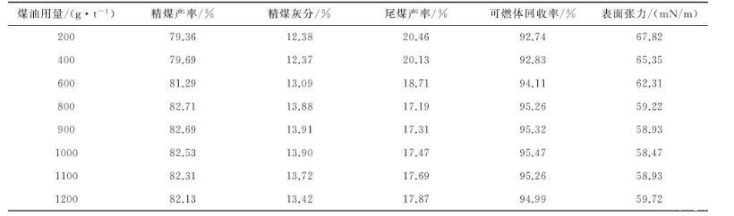 固定仲辛醇(起泡劑)用量為200 g/t,改變煤油(捕收劑)用量,同步進行浮選和表面張力試驗,結(jié)果見表2。