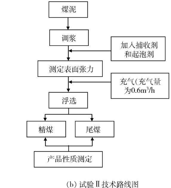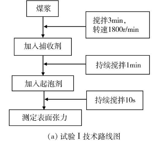 試驗分為試驗Ⅰ和試驗Ⅱ兩部分。在試驗Ⅰ中,先后改變捕收劑和起泡劑用量,對添加浮選藥劑后煤漿的表面張力進行測定,以研究浮選藥劑用量對煤漿表面張力影響的規(guī)律。在試驗Ⅱ中選用煤油/仲辛醇做捕收劑/起泡劑,先后改變煤油和仲辛醇的用量,按照《GB/T 4757-2013煤粉(泥)實驗室單元浮選試驗方法》對馬蘭2#煤泥進行浮選試驗,并在浮選充氣前對煤漿同步進行表面張力的測定,進一步對浮選過程中浮選藥劑量、煤漿表面張力及浮選效果之間的關(guān)系進行探索。試驗控制煤漿濃度為100 g/L,溫度為22±0.2℃;使用一次去離子水(pH值為7.0±0.2)。試驗技術(shù)路線見圖1。