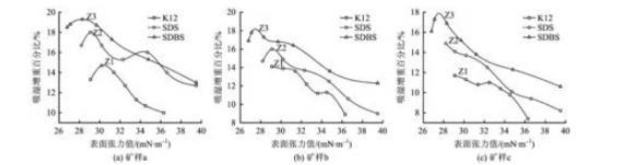 試驗選擇3種陰離子表面活性劑(均為化學純)。分別是:十二烷基苯磺酸鈉(簡稱SDBS)、十二烷基磺酸鈉(SDS)、十二烷基硫酸鈉(K12)。使用QBZY系列全自動表面張力儀測出不同溶液的表面張力,將3種濕潤劑均配制成表面張力范圍在25~40 mN/m的7種水溶液。