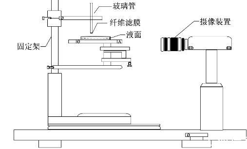 研究礦塵濕潤性能的裝置有很多,根據實際出發,試驗采用毛細管反向滲透法實驗裝置。(1)本實驗選用的玻璃管長度為200 mm,內徑為4 mm,給每個玻璃管劃好刻度,其下端用纖維濾膜密封;(2)用分度值為0.1 mg的光學讀數分析天平稱取1.5 g的礦塵裝入干燥過后的玻璃管中,為提高精度,每次初填至60 mm,然后振實;(3)將玻璃管固定在固定臺上,盛有濕潤劑溶液(約20 mL)的玻璃皿置于載物臺上,旋轉載物臺,使玻璃管底部與溶液表面接觸;(4)當液面透過濾膜后,打開錄像設備記錄反向滲透到20,30,40 mm所需時間,同時記錄3 min后玻璃管的增重作為吸濕量。每種溶液對礦塵做3次試驗,取平均值。實驗裝置如圖1所示。