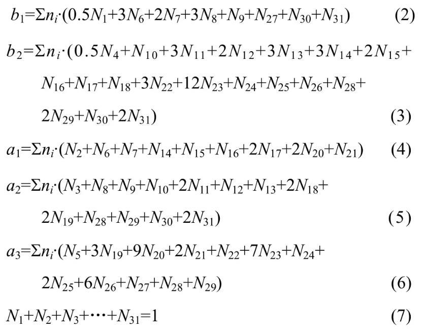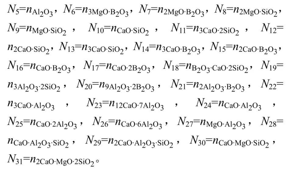 因此,由表1和式(2)~(7)建立計算MgO-B2O3-SiO2-CaO-Al2O3渣系中結構組元和離子對作用濃度Ni的控制方程,其中N6~N31由N1~N5表示出來。在一定溫度下,熔渣成分代入該方程組,采用迭代法計算出所有結構組元和離子對的作用濃度。