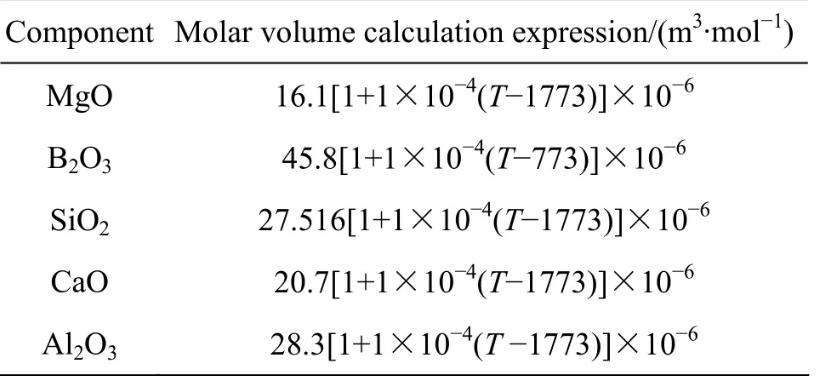 表1 MgO-B2O3-SiO2-CaO-Al2O3渣系中復雜分子的化學反應及標準Gibbs自由能和作用濃度的表達式