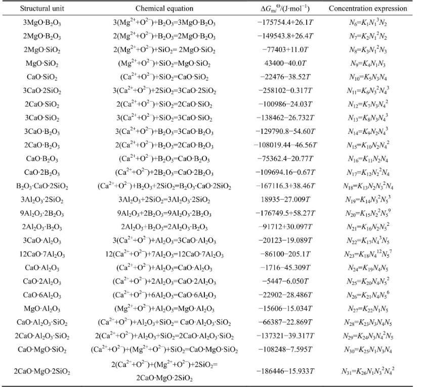 根據共存理論以及上述確定的MgO-B2O3-SiO2-CaO-Al2O3富硼渣體系熔渣中存在的結構單元,定義熔渣中成分分別為。結構組元作用濃度符號表示為: