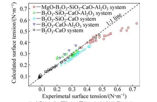 圖1 MgO-B2O3-SiO2-CaO-Al2O3體系相關渣系表面張力計算值與文獻實驗數據的比較