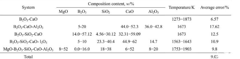 表4富硼渣相關實驗渣系組分、溫度及相對平均誤差