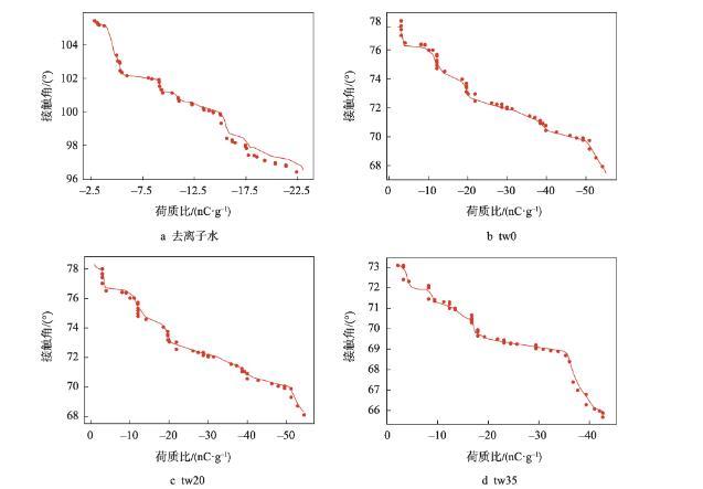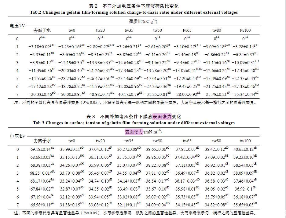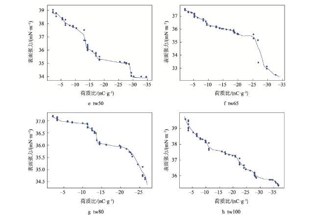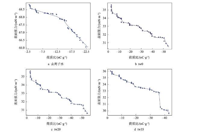 隨著膜液中吐溫20的減少和司盤20的增多,明膠液滴荷質(zhì)比亦呈增高趨勢(shì)(<0.05)。張建桃等[13]研究表明,介質(zhì)的電導(dǎo)率改變會(huì)引起其荷電性能的改變。相同質(zhì)量濃度下司盤20的物質(zhì)的量濃度更高,導(dǎo)致溶液電導(dǎo)率及液滴荷質(zhì)比增加更為明顯。然而,與只添加吐溫20的明膠溶液(tw100)相比,少量司盤20的添加(tw80)還會(huì)引起荷質(zhì)比的顯著減少(<0.05),推測這是由于溶液中吐溫20與司盤20分子通過“經(jīng)典疏水作用”在水溶液中優(yōu)先結(jié)合,從而使溶液中總?cè)苜|(zhì)相對(duì)濃度下降導(dǎo)致[14]。