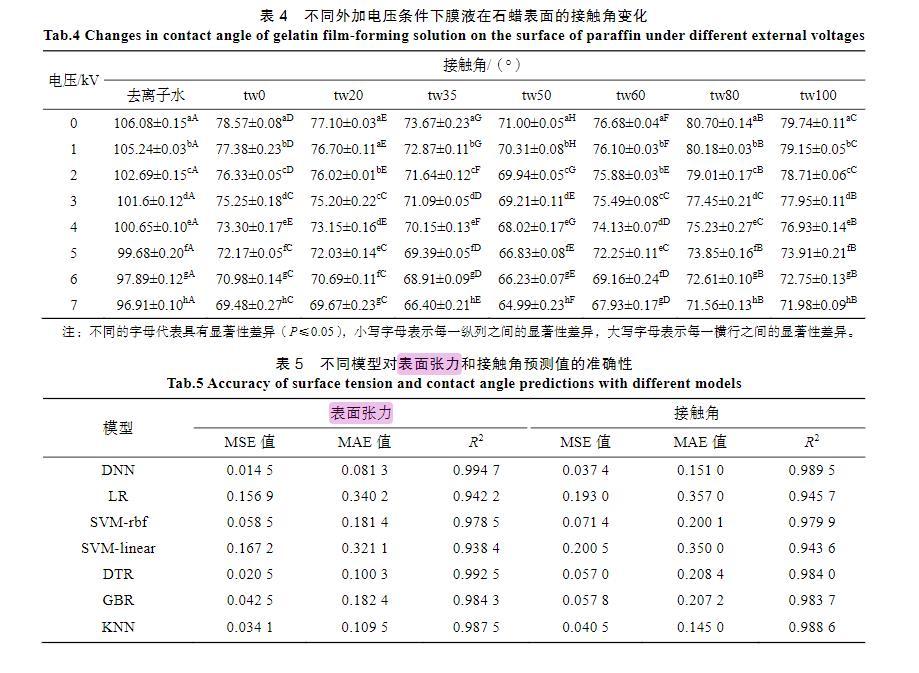 本文探究了在不同電源電壓下通過感應(yīng)荷電的方式對(duì)明膠液滴荷質(zhì)比、表面張力及接觸角的影響,并通過深度神經(jīng)網(wǎng)絡(luò)建立模型預(yù)測。結(jié)果發(fā)現(xiàn),靜電荷電能有效提高明膠液滴的潤濕性能,當(dāng)外加電壓為7 kV時(shí),明膠成膜液滴的表面張力可以下降9%~14%,接觸角能夠下降8%~12%。從而為形成更均勻、更完整的可食性涂膜提供新的手段。在明膠的質(zhì)量分?jǐn)?shù)為3%、表面活性劑的質(zhì)量分?jǐn)?shù)為0.05%、吐溫20與司盤20濃度比為1∶1、電壓為0~7 kV時(shí),深度神經(jīng)網(wǎng)絡(luò)模型對(duì)膜液荷質(zhì)比與表面張力或接觸角的關(guān)系具有良好的預(yù)測作用,可用于指導(dǎo)實(shí)踐操作。