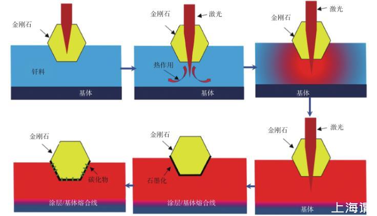 試驗所用激光波長為1.075μm,因此在激光釬涂過程中,激光會透射金剛石而直接加熱釬料,釬料吸收激光能量而迅速升溫、熔化,形成熔池。熔池熱量向金剛石傳導,潤濕金剛石,并誘導與熔池接觸的金剛石表面部分石墨化,與熔池中的Cr等元素發生反應,形成鉻的碳化物,增強了金剛石與釬料之間的冶金結合強度。釬料直接受熱升溫,金剛石被釬料熱傳導后吸熱升溫。金剛石透射激光的高效低損傷熱作用特性會有效避免金剛石在釬涂過程中的過熱損傷,這是激光釬涂金剛石涂層的最大潛在優勢之所在,金剛石透射激光的熱作用如圖13所示。