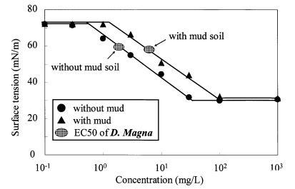 圖 11 泥土存在對(duì)地表的影響 LAS 和有毒表面張力的張力曲線 Daphnia Magna 的價(jià)值。