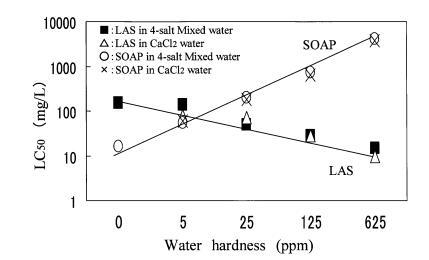 圖 5 水硬度對(duì)急性毒性的影響 LAS 和 SOAP 到 Daphnia Magna 的 4 鹽混合 水。