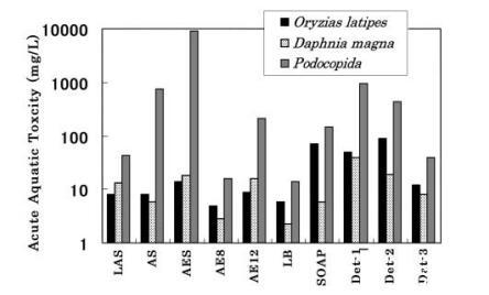 7 種表面活性劑和 3 種商品化劑的急性毒性 使用 3 種測(cè)試生物測(cè)量清潔劑: oryzias latipes、daphnia magna 和 podocipida。 結(jié)果 如圖 1 所示。在所有情況下,EC50 和/或 LC50 podocopida 高于 oryzias latipes 和 daphnia magna。 SOAP 和 LB 的毒性值 oryzias latipes 高于 daphnia magna, 而其他 5 種表面活性劑的毒性值 oryzias latipes 或 daphnia magna 幾乎相等。 這 表面活性劑可分為三類; 低毒 組(AES、SOAP 和 AE12),中毒性組(LAS 和 AS) 和高毒組 (AE8 和 LB)。