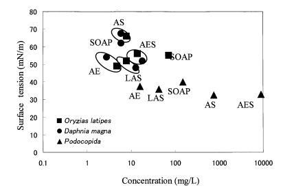 SOAP 的毒性值繪制在圖 8 中的表面張力曲線上。 oryzias latipes 和 podociida 可以確定為大約 55 分別為 mN/m 和 40-45 mN/m。 兩個(gè)范圍的gtox 然而,獲得了 daphnia magna 的值:73 mN/m 在水硬度為 5 ppm 和大約 60 mN/m,水硬度為 25-625 ppm。