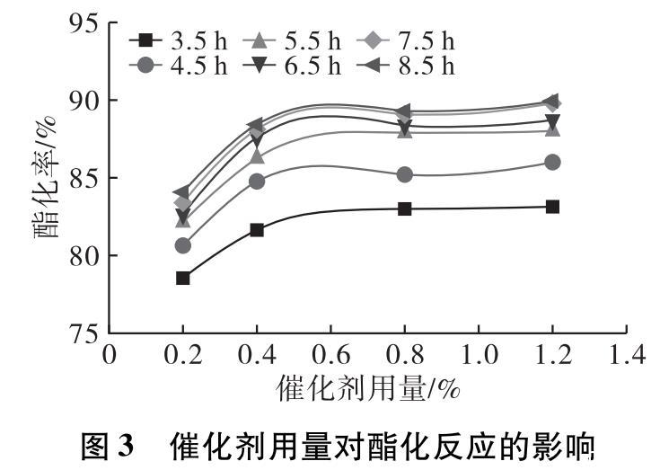 在投料比1∶1,預熱溫度80℃,預熱時間5 min,催化劑選擇4?型分子篩,反應溫度140℃,反應時間8.5 h,催化劑用量分別為0.2%、0.4%、0.8%、1.2%條件下進行酯化反應。反應3.5 h后每隔1 h取樣測試產物酸價,計算酯化率隨時間的變化,結果如圖3所示。