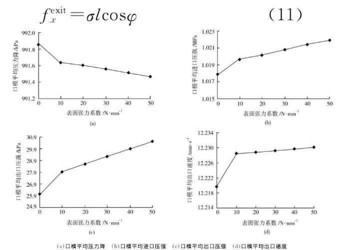 (2)在微擠出中,表面張力系數越大,擠出脹大越明顯,擠出口模內熔體的進出口壓強都明顯增大,口模內熔體的壓力降略微減小,平均出口速度略微增大,自由表面出口壓力與平均出口速度都明顯減??;