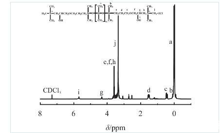 圖2中DAT的1H-NMR譜化學(xué)位移歸屬為:0.01(aH),0.1(bH),0.45(cH),1.53(dH),3.4(eH),3.6(fH),4.32(gH),3.55(hH),5.71(iH),3.35(jH),7.3(CDCl3溶劑峰)。