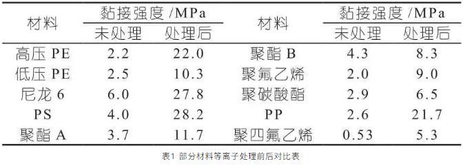 等離子法技術是利用等離子體高能轟擊、活化反應等物理化學方法,將污染物從工件上剝離去除的一種工藝方法。起到表面有機物除去,有機物除去后表面活性化。用等離子法處理PP、PE、聚四氟乙烯等難黏接材料的黏接強度大大提高。經處理后接觸角降低,表面張力改變,增加黏接劑對其浸潤和黏接力。如表1所示。等離子法處理需要投入處理設備,要根據實際需要選擇。