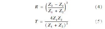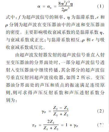 由超聲波發(fā)射器發(fā)射的超聲波信號垂直入射至變壓器油的分界面處時,一部分超聲波信號透射入變壓器油中繼續(xù)傳播,其余部分的超聲波信號垂直反射回超聲波接收器,如圖2所示。變壓器油分界面處的聲壓和質點的振速滿足連續(xù)原則,則可求得聲壓反射系數(shù)和聲壓透射系數(shù)分別為: