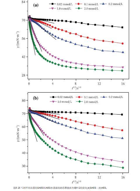 圖4 25℃時不同濃度的SAES和AES水溶液的動態(tài)表面張力(a)SAES;(b)AES。