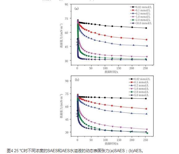從圖4可以看出所測不同濃度不同表面活性劑的表面張力在初始階段均快速下降,一定時間后趨于平穩(wěn)狀態(tài)。這是因為動態(tài)表面張力測試過程中新形成的表面遠(yuǎn)偏離于平衡態(tài),吸附層離子的濃度很低,體相與吸附層的濃度差大,因此動態(tài)表面張力變化很大。隨著吸附的進行,次表面濃度和表面濃度逐漸增大,擴散和吸附的速度均逐漸降低,動態(tài)表面張力隨著吸附時間的增加而降低的趨勢也逐漸變得平緩。當(dāng)表面活性劑濃度增大時,表面張力的下降幅度和速度也隨之增大,而且相應(yīng)地縮短了到達(dá)平衡狀態(tài)的時間。這種隨體系濃度的增加達(dá)到平衡所需的時間越短的趨勢與已經(jīng)報道的一些烷基表面活性劑的結(jié)果是相一致的。在相同濃度下,SAES表面張力下降的速率大于AES,這是由于SO4-在碳?xì)滏溨虚g的化合物比在端點者擴散速度快。