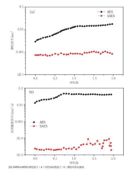 圖2 SAES與AES的彈性因子(a)和宏觀黏度因子(b)隨時間變化曲線