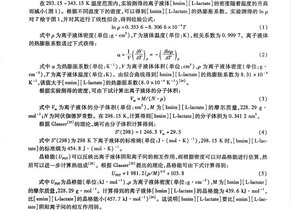 離子液體物理化學(xué)性質(zhì)的研究對離子液體的設(shè)計(jì)和應(yīng)用具有重要的指導(dǎo)作用,而對于離子液體與分子溶劑(例如水)的混合物性質(zhì)研究將會(huì)揭示該類液體的新的應(yīng)用。筆者在不同溫度下測定帶有手性陰離子的純離子液體1-丁基-3-甲基-咪唑乳酸鹽([bmim][L-lactate])及[bmim][L-lactate]+H2O二元混合物的密度和表面張力,并對其體積性質(zhì)和表面性質(zhì)進(jìn)行研究。以期進(jìn)一步豐富手性離子液體與分子溶劑二元混合物的物理化學(xué)性質(zhì)數(shù)據(jù),為其應(yīng)用提供更多的理論依據(jù)。