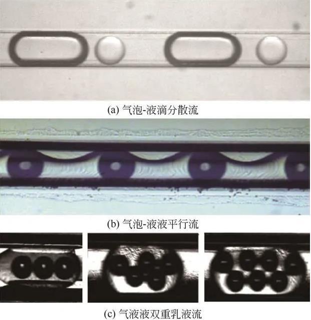 上述不同類型的微通道中所形成的流型也是學(xué)者們重點(diǎn)關(guān)注的內(nèi)容。在材料制備領(lǐng)域,流型是決定合成材料結(jié)構(gòu)的關(guān)鍵因素且直接影響著材料的相關(guān)性能;在過程強(qiáng)化領(lǐng)域,不同流型的強(qiáng)化效果差別較大,選擇并調(diào)控合適的流型是重中之重;在三相反應(yīng)中,流型可決定反應(yīng)的轉(zhuǎn)化率和選擇性,是需要優(yōu)化的重要參數(shù)之一。相比于兩相體系,三相體系由于流體間更為復(fù)雜的相互作用及更高的自由度而呈現(xiàn)出了更多的流動(dòng)形態(tài)(圖3)。如Su等在十字形微通道中成功調(diào)控出液滴氣泡間隔排列的氣液液三相流。Xu等基于同軸環(huán)管微設(shè)備實(shí)現(xiàn)了氣液液雙乳液的可控制備,并揭示了流量和界面張力等因素對(duì)雙乳液結(jié)構(gòu)的影響。Wang等在雙T形通道內(nèi)通過調(diào)節(jié)操作條件可控制備了“水包油包氣”和“含有氣泡的液液平行流”兩種結(jié)構(gòu)。Rajesh等通過觀察液滴氣泡的形狀及位置關(guān)系定義了“氣柱-液柱”“彈狀-液滴”“液柱-雙氣彈”等流型。除了實(shí)驗(yàn)手段Rajesh等借助VOF數(shù)值模擬方式從機(jī)理上揭示了氣液液三相流的流動(dòng)規(guī)律,歸納了不同Ca和We范圍內(nèi)的流型特征和規(guī)律。此外,Yang等通過傳質(zhì)引發(fā)相分離的方法成功調(diào)控出氣液液雙乳液,該方法能實(shí)現(xiàn)更大范圍內(nèi)氣泡直徑尺寸和液膜厚度的調(diào)節(jié)。