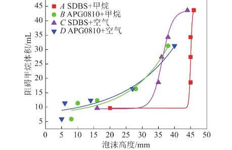 4)泡沫穩(wěn)定性是決定甲烷緩釋效應的關鍵因素,泡沫穩(wěn)定性越強,越能有效控制甲烷流動??芍苯硬扇】諝?表面活性劑泡沫的各項參數(shù)表示泡沫性質。陰離子表面活性劑SDBS表現(xiàn)較好,泡沫穩(wěn)定性較強,隨著時間推移,SDBS也有比APG0810更好控制甲烷釋放的效果。質量分數(shù)為0.15%時,10 min內SDBS可以控制約占總通入甲烷體積87%的甲烷。120 min后仍可控制約占通入總體積49.16%的甲烷。