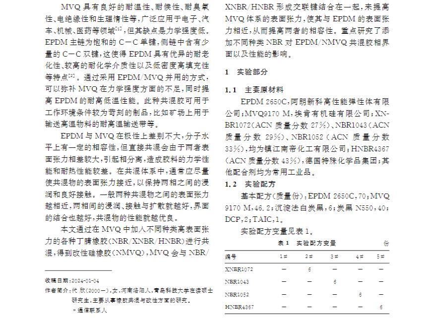 本文通過在MVQ中加入不同種類高表面張力的各種丁腈橡膠(NBR/XNBR/HNBR)進行共混,得到改性硅橡膠(NMVQ),MVQ會與NBR/XNBR/HNBR形成交聯(lián)鍵結(jié)合在一起,來提高MVQ體系的表面張力,使其與EPDM的表面張力相近,從而提高兩者的相容性。重點研究了添加不同種類NBR對EPDM/NMVQ共混膠相界面以及性能的影響。