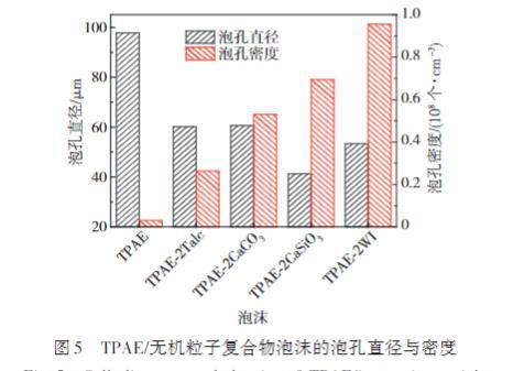 圖5 TPAE/無機(jī)粒子復(fù)合物泡沫的泡孔直徑與密度