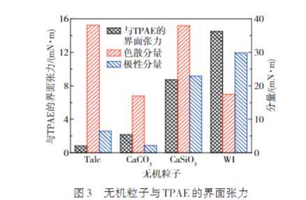 為深入評(píng)估4種無機(jī)粒子與TPAE之間的相容性,本研究采用界面張力儀、接觸角儀計(jì)算了4種無機(jī)粒子與TPAE之間的界面張力,以定量分析其相容性。如圖3所示,可以看出,Talc與TPAE之間的界面張力為0.82 mN/m,表明二者相互作用力較強(qiáng),能夠更好地相互滲透和混合,反映出二者之間存在良好的相容性。