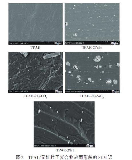 對(duì)比之下,含有CaSiO3、CaCO3、WI無機(jī)粒子的TPAE復(fù)合材料展示出典型的兩相形態(tài),這些粒子在TPAE基體中的均勻分散揭示了TPAE與這3種無機(jī)粒子之間在熱力學(xué)上的不相容性。值得注意的是,相比較于TPAE-2CaCO3和TPAE-2WI,TPAE-2CaSiO3復(fù)合材料的斷面形貌中的CaSiO3粒子表現(xiàn)出明顯的團(tuán)聚現(xiàn)象,這可歸因于CaSiO3獨(dú)特的多孔蜂窩狀結(jié)構(gòu),使得在含量增加時(shí),粒子間相互碰撞并傾向于結(jié)合,容易形成更大的聚集體,使得CaSiO3粒子尺寸顯著大于其他兩種無機(jī)粒子。