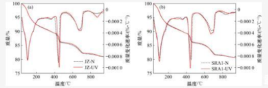 通過TG-DTG程度對比分析60 d齡期時2種環(huán)境條件下水泥水化,熱重分析結果圖6和表4所示。化學結合水和氫氧化鈣的含量可以直觀地反映水化速率和水化程度。如表4所示,經過強紫外線照射后,各組樣品的化學結合水含量和氫氧化鈣含量呈下降趨勢,這是因為強紫外線照射下樣品中的自由水會更快地蒸發(fā),最終導致水化程度降低。此外,對比2種環(huán)境下的碳酸鈣含量發(fā)現,強紫外輻射會促進水泥石的碳化。熱重分析結果與已有的研究結果相似。