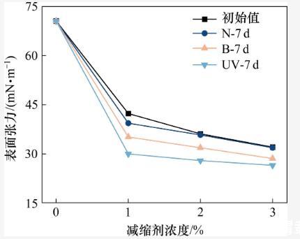 據以往研究,SRA在水泥基材料表面的吸附率通常在10%以下,90%以上的SRA分子溶于溶劑中(包含吸附在氣液界面上的部分)。因此,SRA減縮的理論基礎主要是毛細管張力理論。為了進一步探索減縮劑在強紫外線輻射環(huán)境下的作用機理,測試了減縮劑溶液的初始表面張力,以及溶液經過3種不同環(huán)境(N,UV,B)處理7 d后的表面張力。試驗結果如圖8所示。