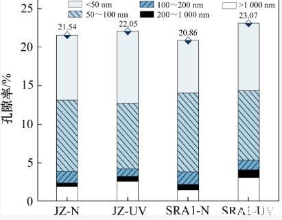2)強紫外線輻射環(huán)境對不同組分水泥石干縮變形的影響不同。與基準組相比,SRA試驗組的干縮值極大程度降低。然而,SRA促進了水泥石的水分散失,增大了水泥石體系中大于200 nm的大孔比例,由此帶來的結構劣化問題不可忽視。