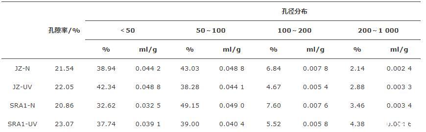 由圖7和表5可以看出:強紫外線輻射使各組樣品的總孔隙率、介孔率(2~50 nm)及大孔率(尤其是200 nm以上的孔)增加,由于彎月面的表面張力效應,介孔的毛細管產生更高的毛細管應力,導致暴露在強紫外輻射環(huán)境中的水泥石產生更大的干燥收縮。同時,經過強紫外線照射后,樣品中大于200 nm的孔隙比例增加。這是由于強紫外線輻射環(huán)境下,水泥凈漿的水化程度降低及水分散失增加導致的。