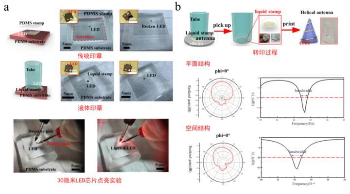 圖2.(a)傳統印章和液滴印章針對超薄LED芯片轉印集成的結果對比;(b)錐螺旋微天線與異形曲面的轉印集成