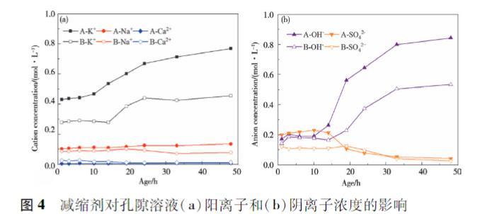 圖4減縮劑對(duì)孔隙溶液(a)陽離子和(b)陰離子濃度的影響