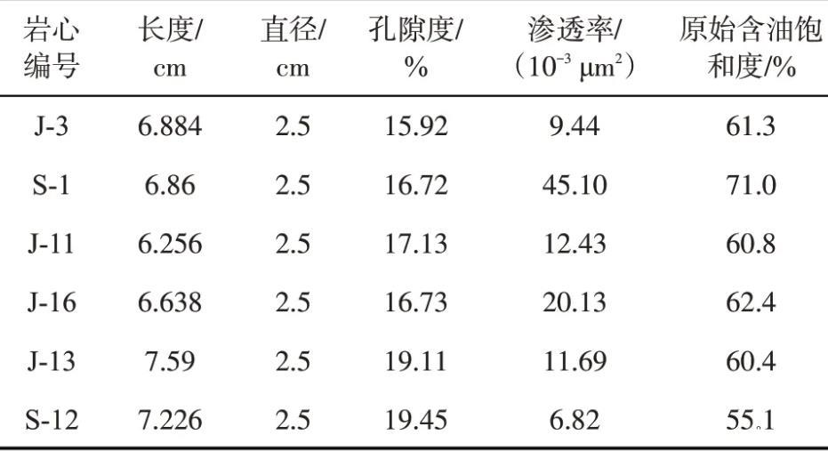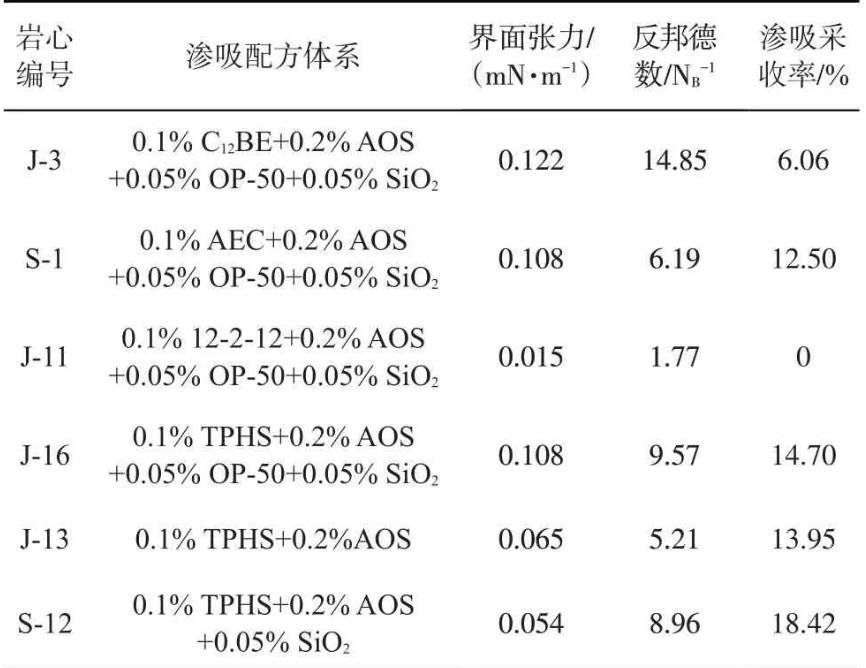 為驗(yàn)證TPHS活性納米流體在滲吸采收率的應(yīng)用,采用靜態(tài)滲吸實(shí)驗(yàn)開(kāi)展TPHS及常見(jiàn)表面活性劑復(fù)配溶液滲吸效果對(duì)比研究,巖心的基本物性參數(shù)見(jiàn)表2,不同體系與原油間的界面張力、所計(jì)算的反邦德數(shù)和滲吸采收率結(jié)果見(jiàn)表3,結(jié)果表明在滲吸過(guò)程中毛管力起主導(dǎo)作用。