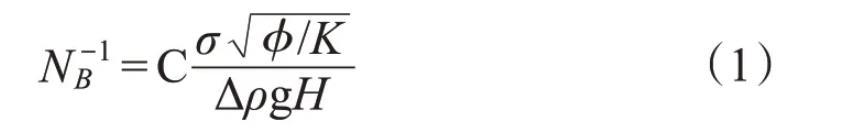 NB-1為滲吸機(jī)理判別參數(shù),式中沒(méi)有考慮巖石潤(rùn)濕性。NB-1>5時(shí),毛管力在滲吸作用中起主導(dǎo)作用;1<NB-1<5時(shí),重力和毛管力同時(shí)起作用;NB-1<<1時(shí),重力起主導(dǎo)作用。
