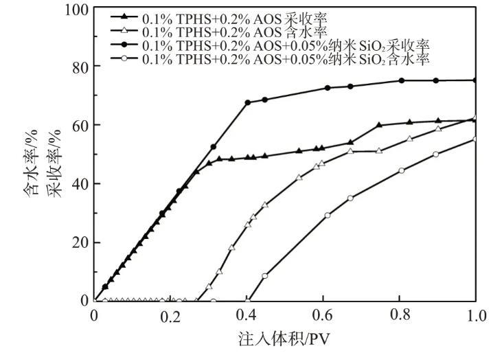 少量納米SiO2顆粒與TPHS、AOS復(fù)配即可產(chǎn)生潤(rùn)濕協(xié)同作用,提高滲吸速率和采收率,并能形成乳液穩(wěn)定油墻,延長(zhǎng)無(wú)水采油期。