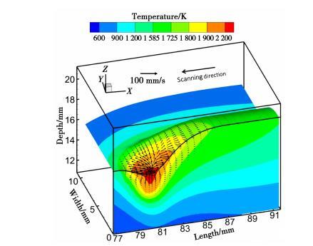 電弧壓力是形成熔池凹陷區(qū)的驅(qū)動(dòng)力。熔池中心表面的液態(tài)金屬受到較大的壓力,向周圍移動(dòng)。液態(tài)金屬在熔池中心區(qū)域流速最大,而越靠近熔池底部流速越小。這種流動(dòng)模式允許更多的熱量從熱源傳遞到熔池底部,從而導(dǎo)致深度滲透。如圖2所示,液態(tài)金屬在電弧壓力的驅(qū)動(dòng)下被推到熔池的后部,并在凝固時(shí)形成冠狀。
